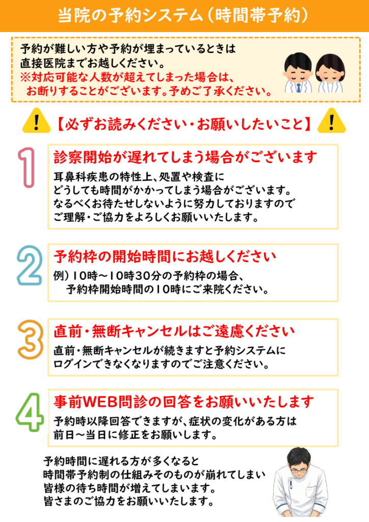 当院は日時予約制を採用していますが、無断で予約キャンセルをする方が多くなっております。予約キャンセルは他患者様の受診機会を逃してしまう事になりますので、ご来院が可能な方のみご予約をお願いします。